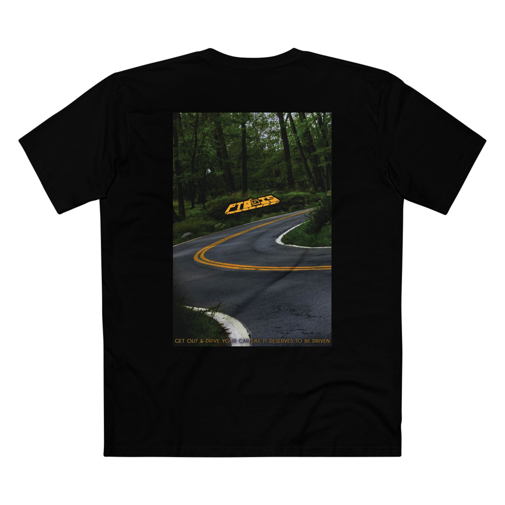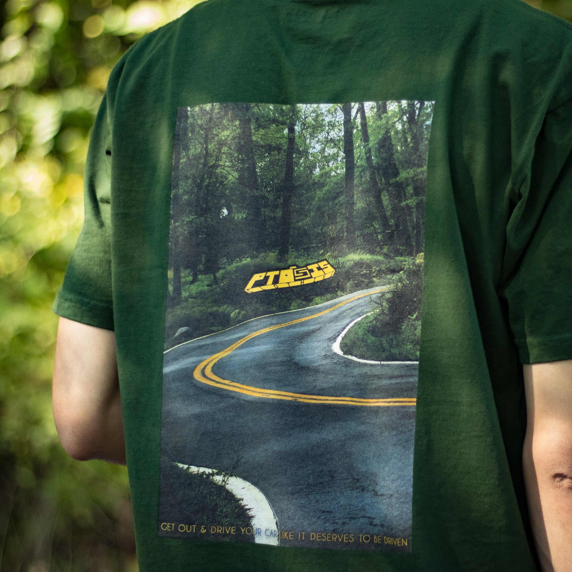 A tee for the ones who drive their car like it deserves to be driven. The front of this tee features our small Ptosis Clothing logo printed on the left chest area and a large print of a twisty road that can excite any driving enthusiast on the back.