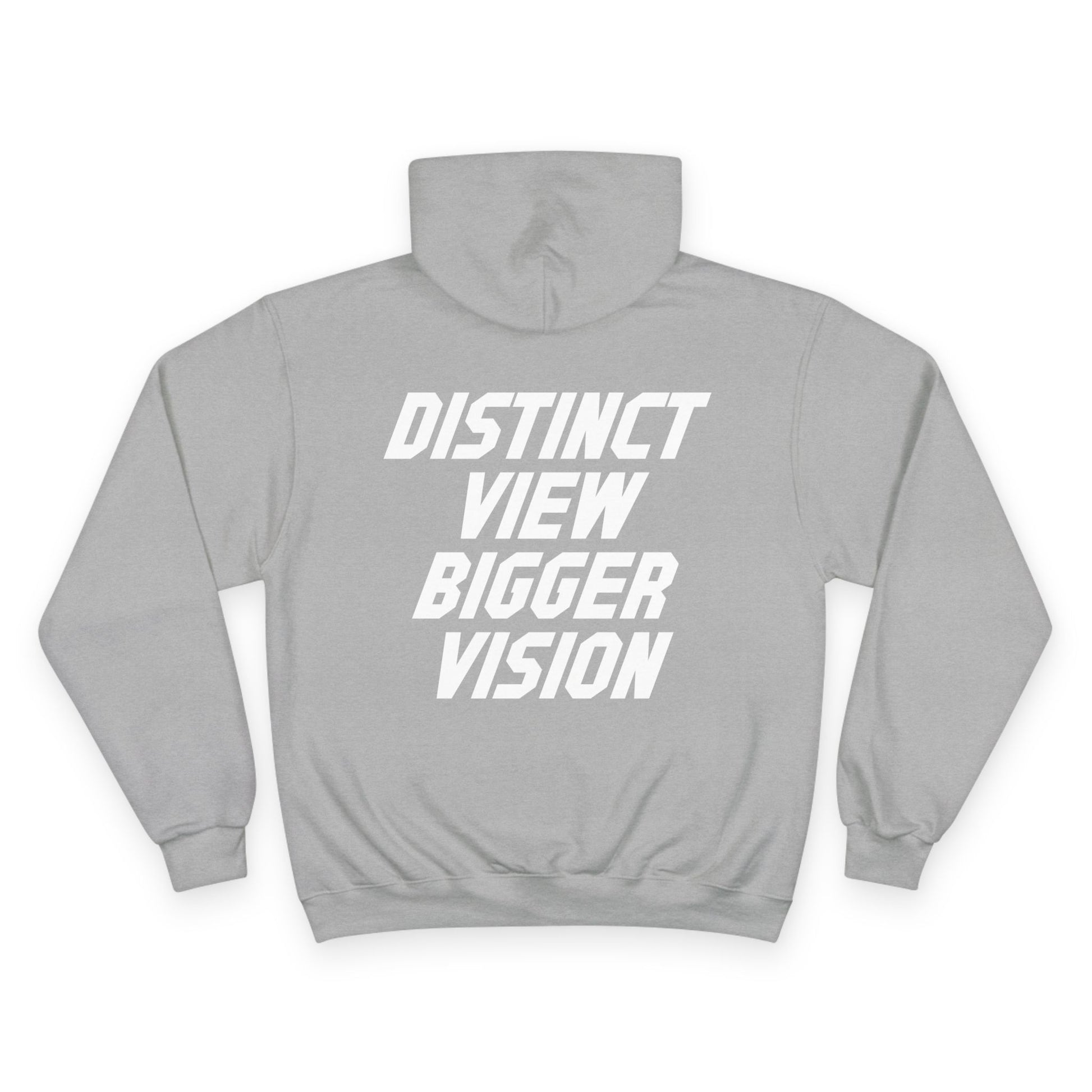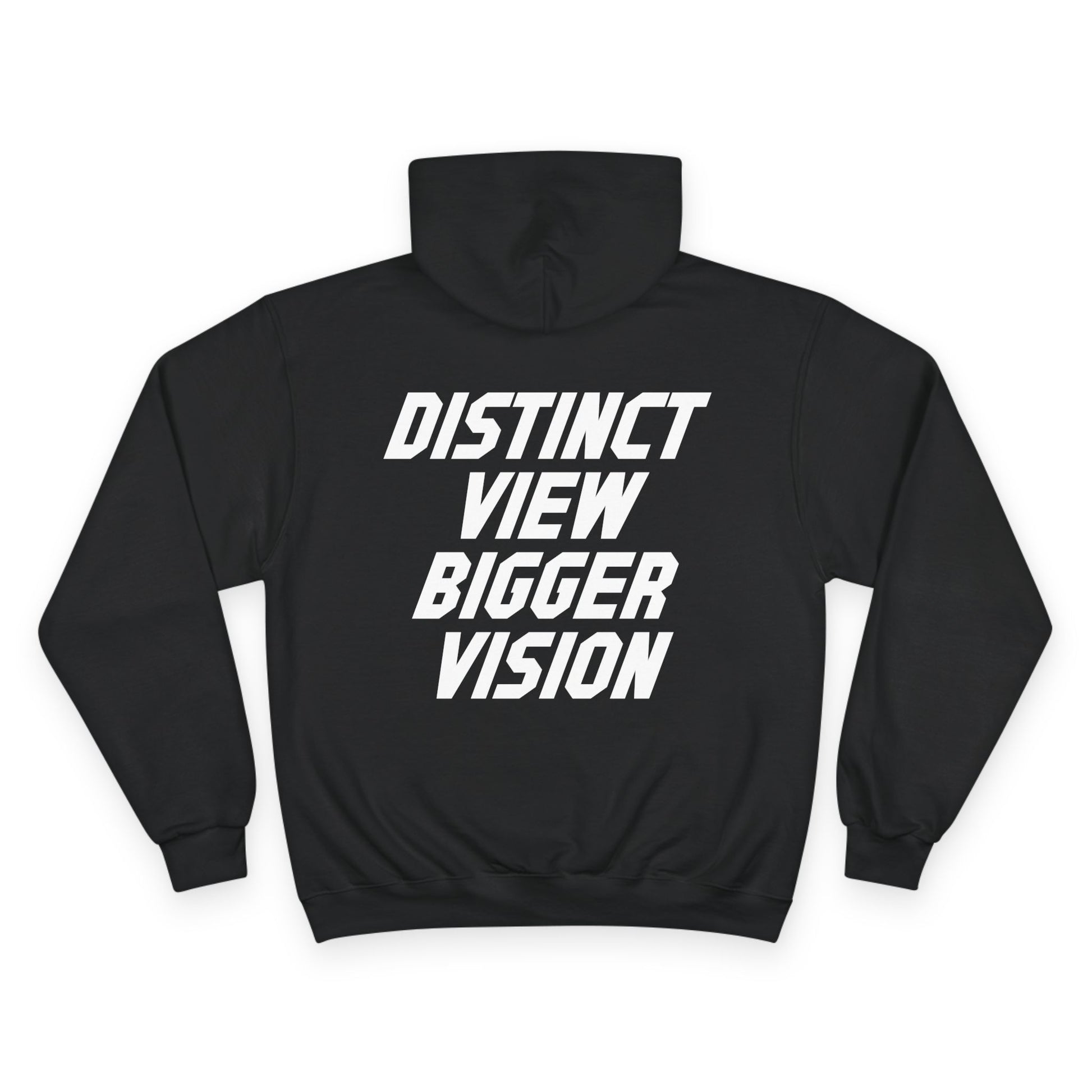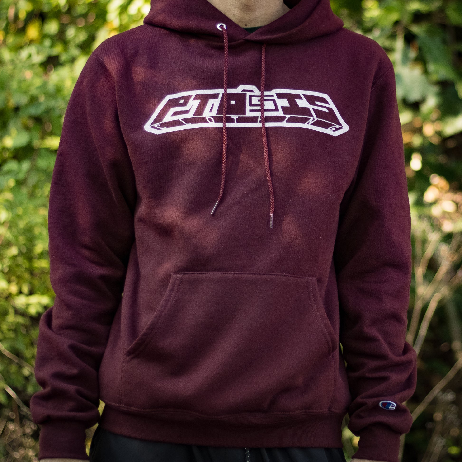 A Champion Hoodie featuring the large, arched Ptosis Clothing Logo printed on the front and our slogan in large print on the back.