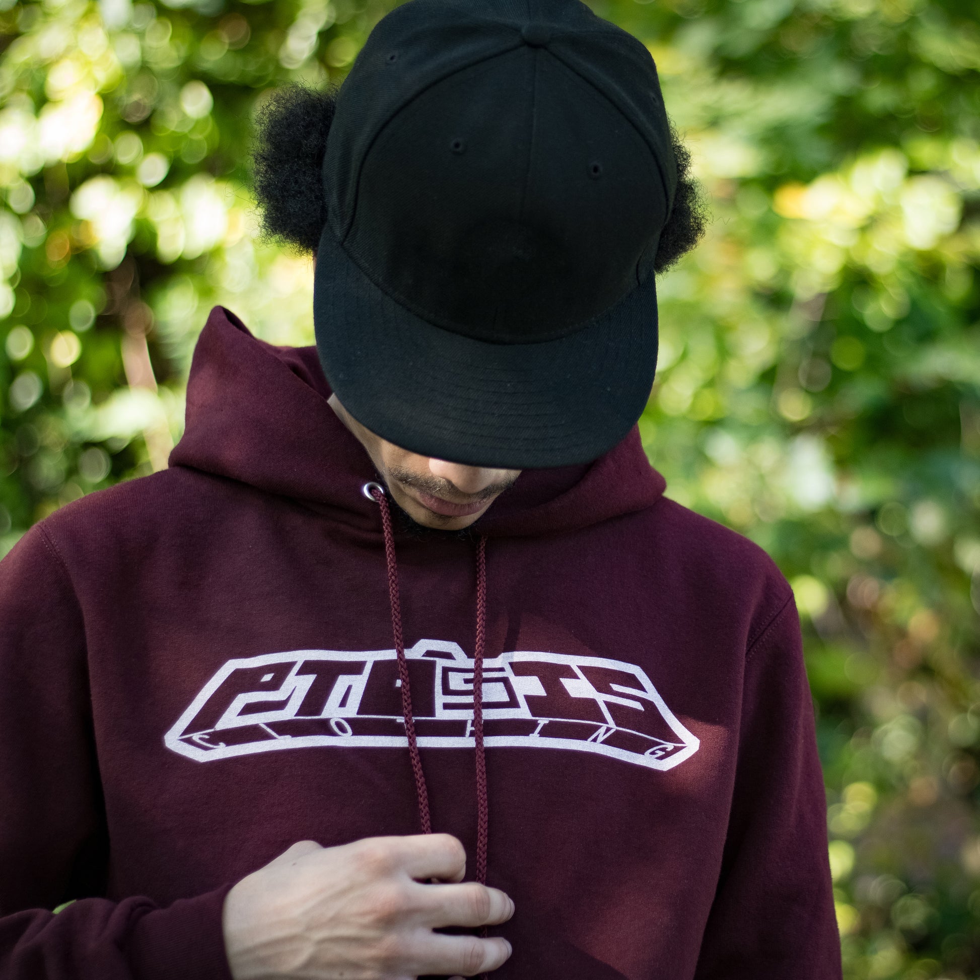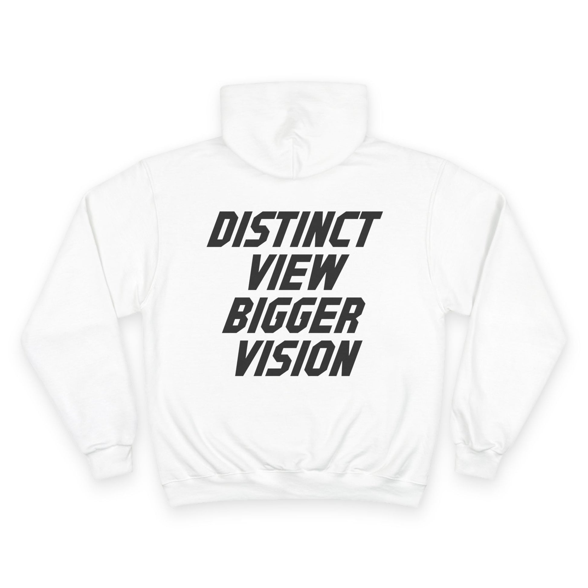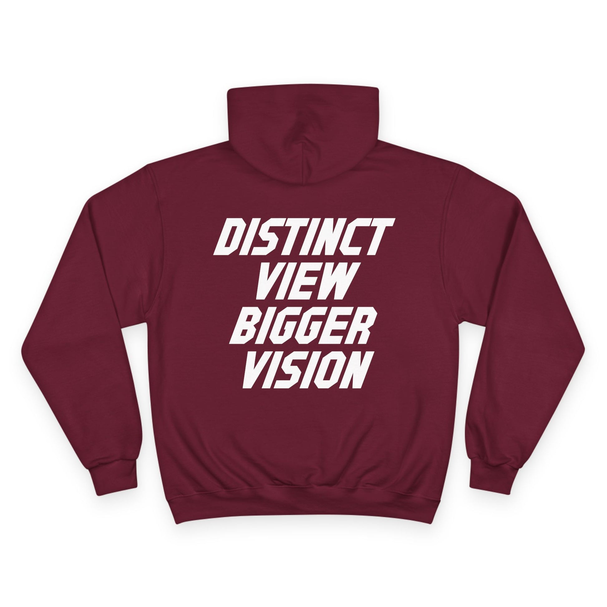 A Champion Hoodie featuring the large, arched Ptosis Clothing Logo printed on the front and our slogan in large print on the back.